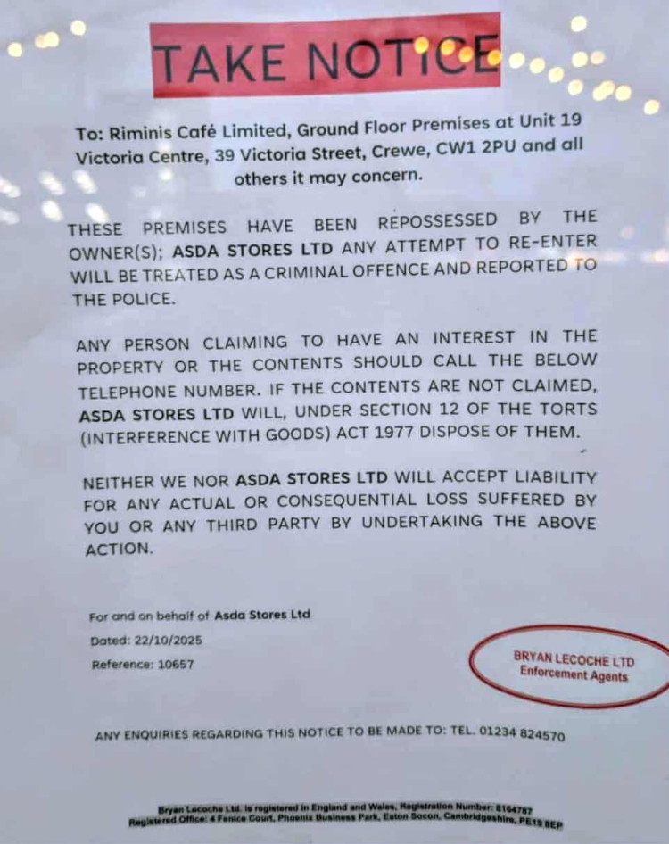 A closed down café and Turkish grill in Crewe has been repossessed by Asda, after bailiffs took enforcement action on the town centre building.
