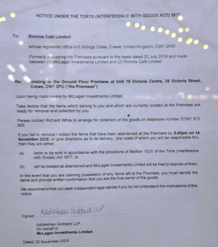 Riminis, 39 Victoria Street, had until 5pm on Friday 14 November to collect abandoned items left at the premises.