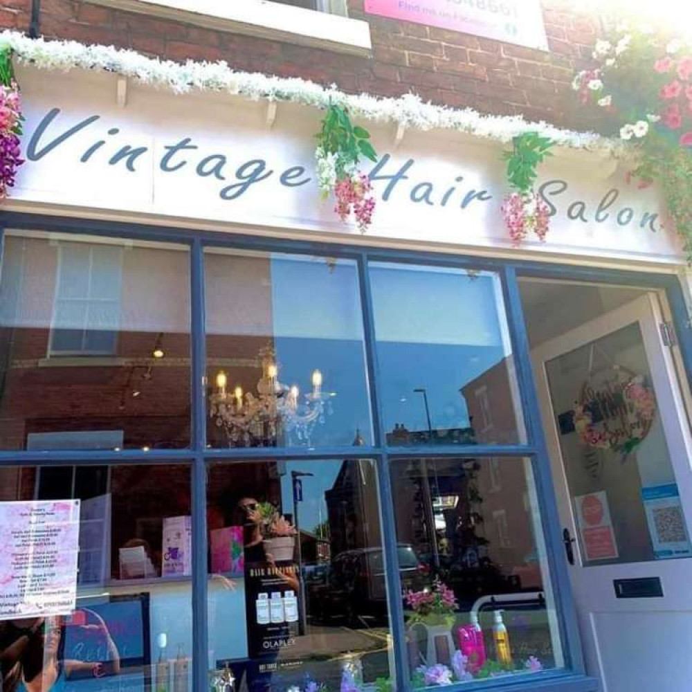 Helen created a huge flower wall at Vintage Hair Salon in Sandbach and an outside display, providing a stunning eye-catching frontage to the Welles Street business.