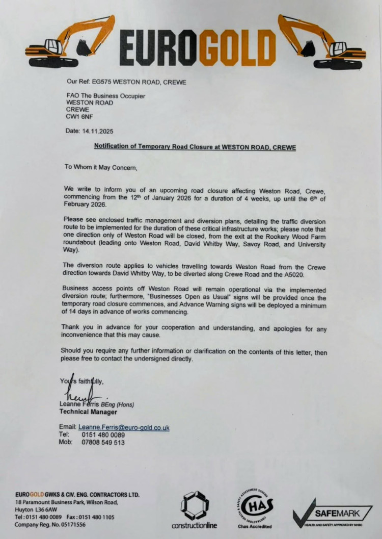 Upcoming four-week road closure announced in Crewe following October's traffic chaos